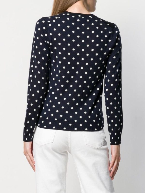 Navy Blue Wool Polka-Dot Knit Sweater from Comme Des Garçons Play. Featuring a V-Neck, Long Sleeves, a Ribbed Hem and Cuffs.